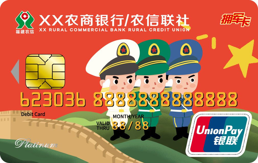“福万通·拥军卡”是福建省农村信用社(农商银行)面向烈士遗属、因公牺牲军人遗属、病故军人遗属、现役军人、现役军人家属、残疾军人、退伍红军老战士(含西路军红军老战士和红军失散人员)、老复员军人、军队离退休干部和退休士官、军队转业干部、复员干部、退役士兵等10类客户发行,具备存取现金、转账汇款、消费、账户管理、智能理财、自助融资、预约转账等功能的专属借记卡。